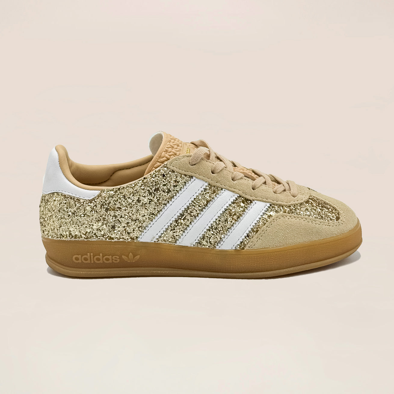 Originally designed as indoor training shoes, the adidas Gazelle has become a timeless icon over time. Faithful to the original, these sneakers are personalized with finely stitched champagne glitter.